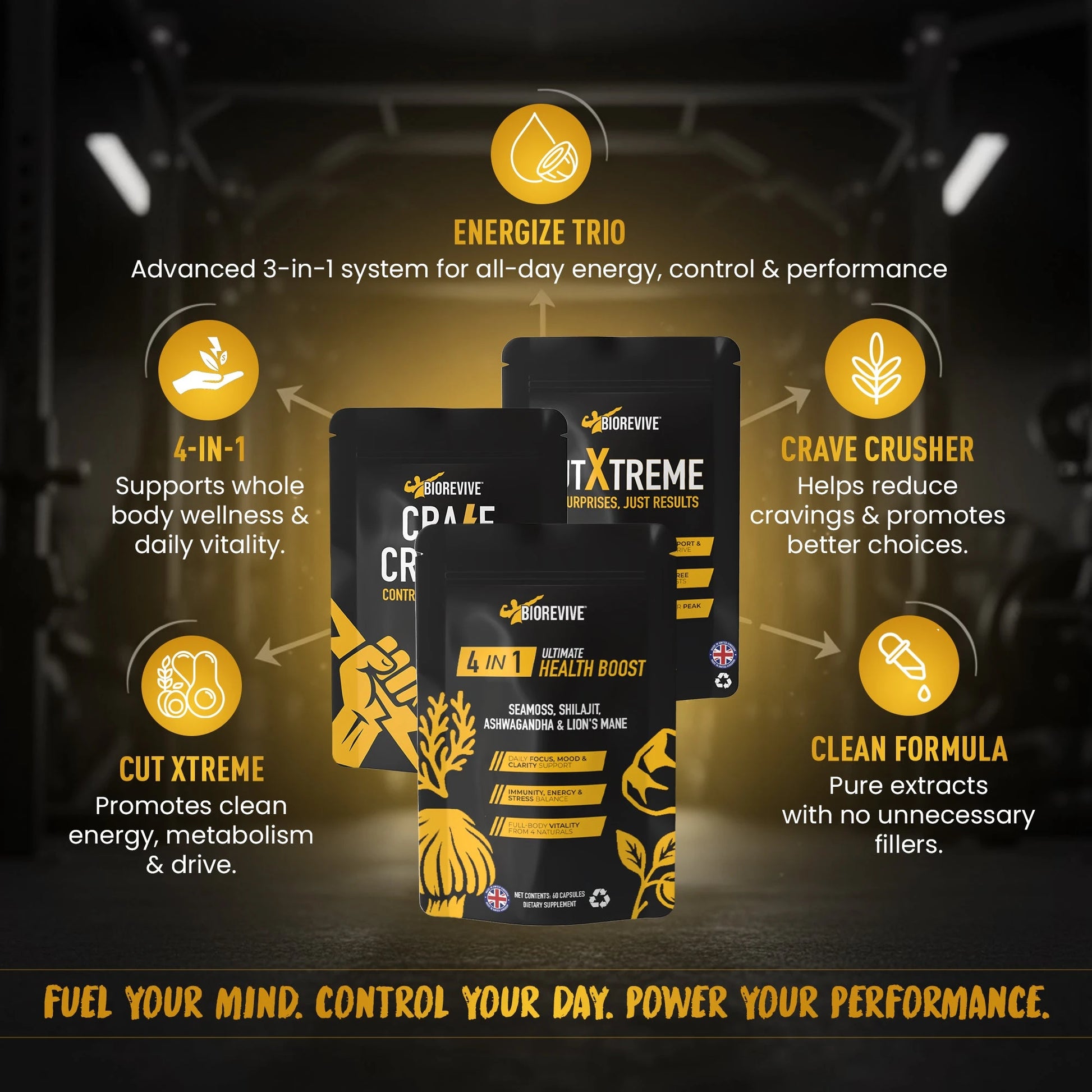 This bundle includes: 4in1 for your ultimate health boost, Crave Crusher for more mindful eating habits and less cravings and Cut Xtreme for energy, focus and wellness support
